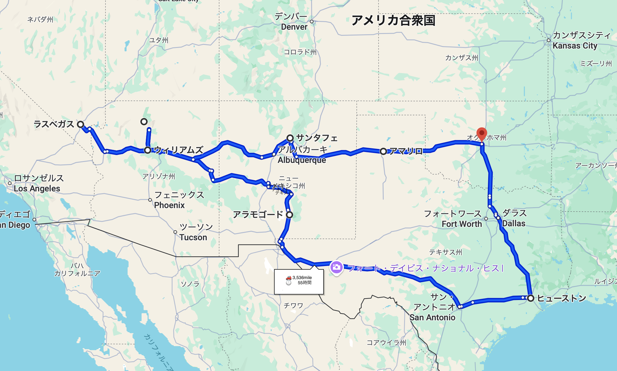 出発地はオクラホマ。まずはヒューストンへ立ち寄り、そのまま西へ進んで観光をしながらラスベガスまで。そして再びオクラホマへ戻るという、全11日間にわたり、総移動距離は 約3,536マイル(約5,691km)、総運転時間は 約55時間の大移動の旅でした。