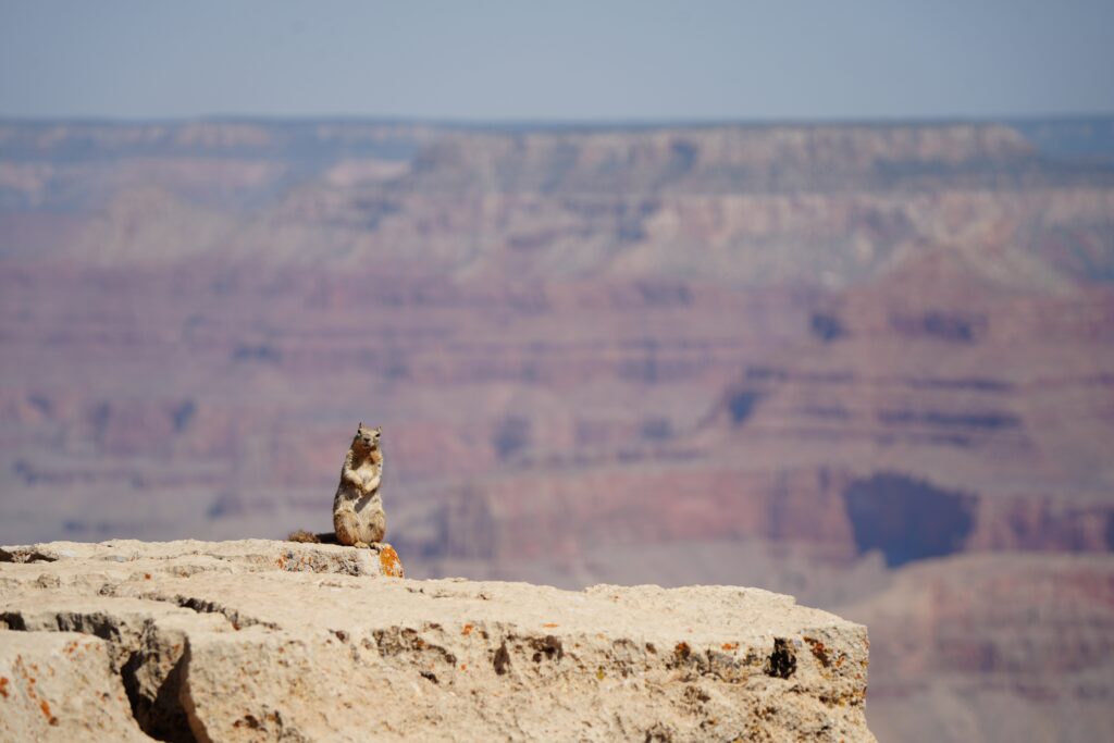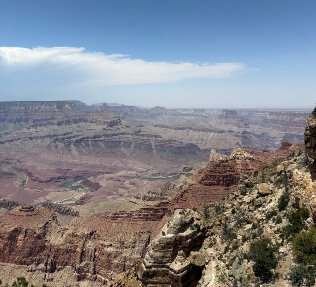 グランドキャニオンの壮大な景色に感動の連続でした。場所によっては、グランドキャニオンの下を流れる コロラド川 を遠くに望むことができ、その美しい青さが大地の赤い地層と対照的で、とても印象的でした。