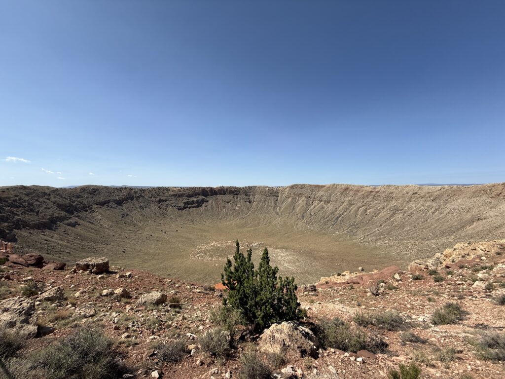 最初に立ち寄ったのは、フラッグスタッフ近郊にある メテオクレーター。 約5万年前に隕石が落下してできたとされる、地球上でも保存状態の良い隕石跡のひとつです。