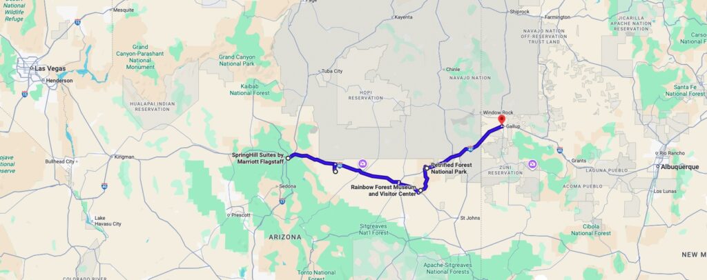 今回は旅の9日目。アリゾナ州フラッグスタッフからニューメキシコ州ギャラップまで移動します。 この日は I-40 を走りながら、途中にある メテオクレーター(隕石跡) と Petrified Forest National Park(化石の森国立公園) に立ち寄りました。