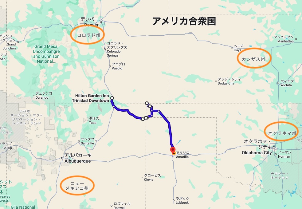 旅の5日目は、コロラド州からさらに南下し、テキサス州アマリロを目指しました。